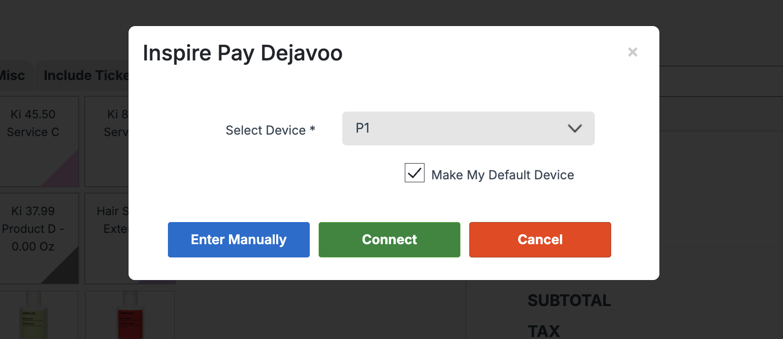 Moving forward, all transactions will automatically try to connect to this device. If it is not able to connect, a pop up will appear to select a different device or enter manually.