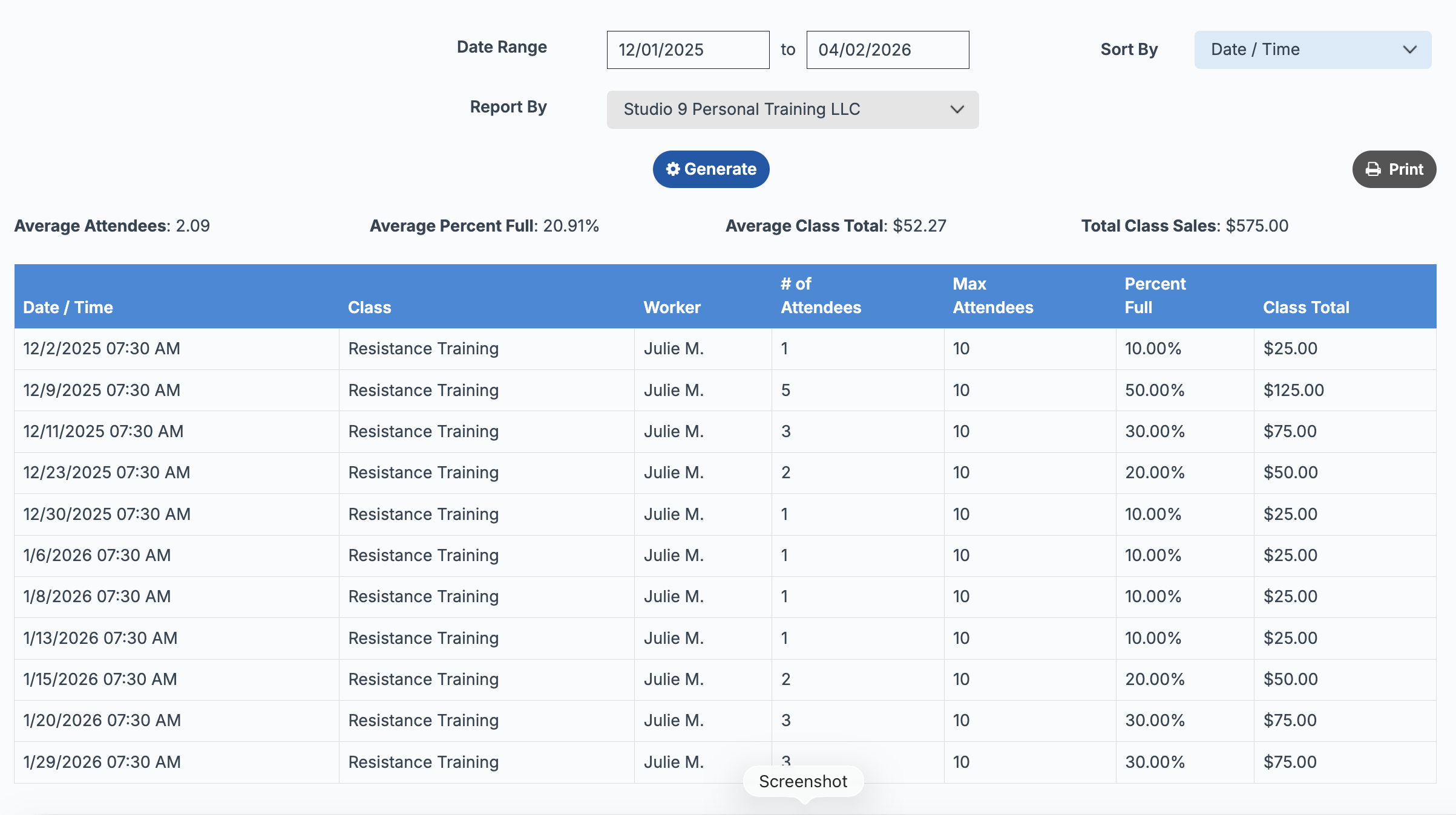 The Class Sales Report provides valuable insight into how your classes are performing. Use this report to track attendance, revenue, and overall class popularity—all in one place.