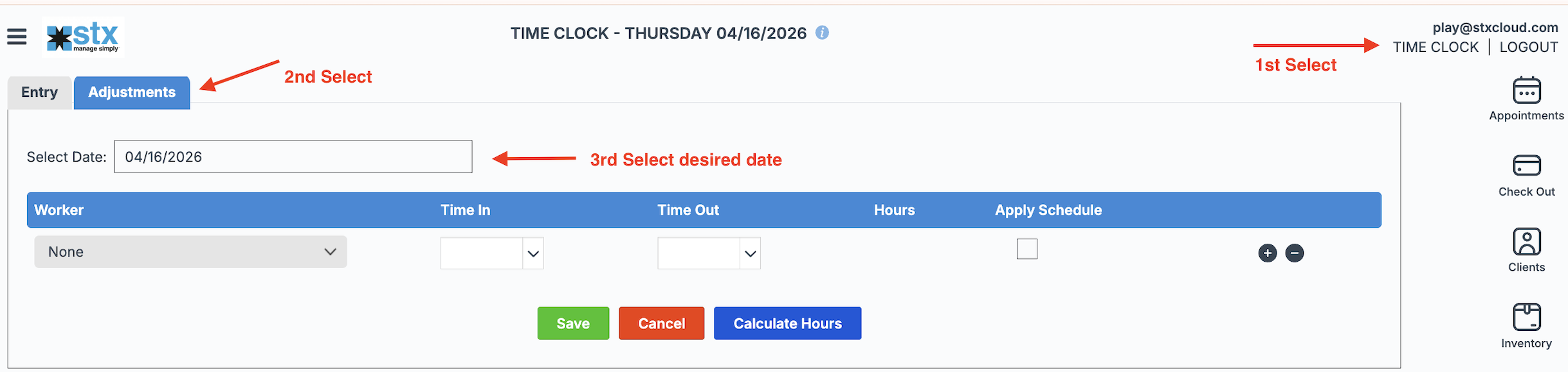 You can easily update or correct a worker’s time clock entries using the Adjustment tab.