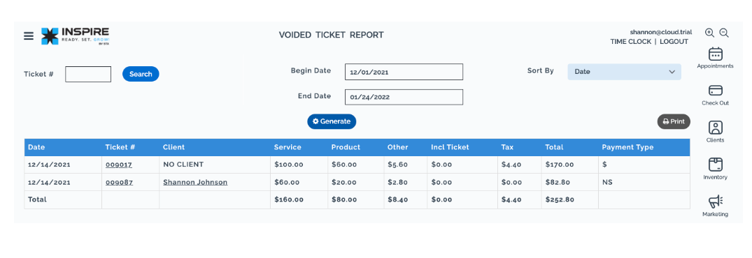 Utilice la fecha de inicio y la fecha de finalización para buscar boletos anulados en una tarifa de fecha. Utilice las Opciones de clasificación en la parte superior derecha para ordenar por Fecha, Número de boleto, Monto o Nombre.