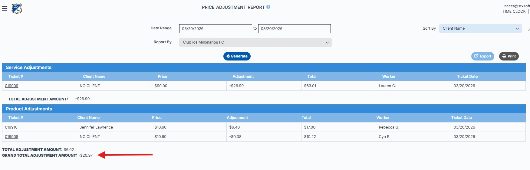 The Price Adjustment Report provides a detailed view of any changes made to the original price of services or products. This includes both increases and decreases, giving you clear visibility into pricing adjustments across your business.