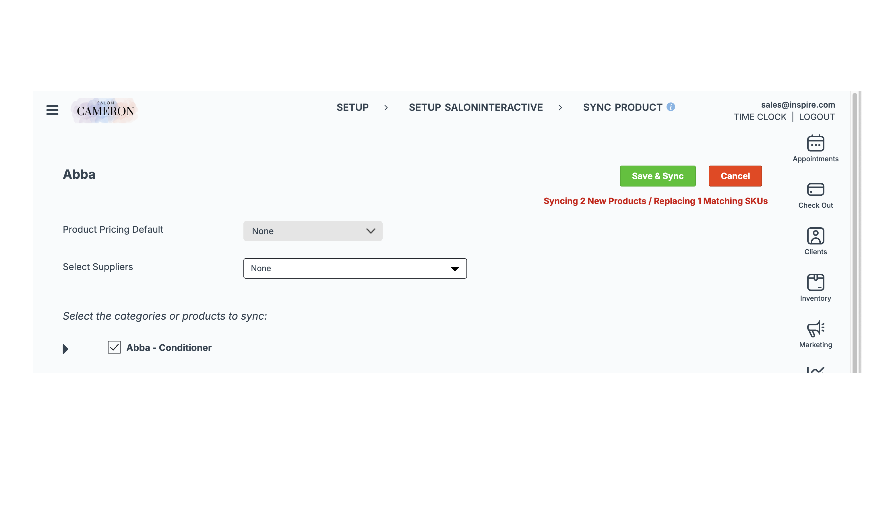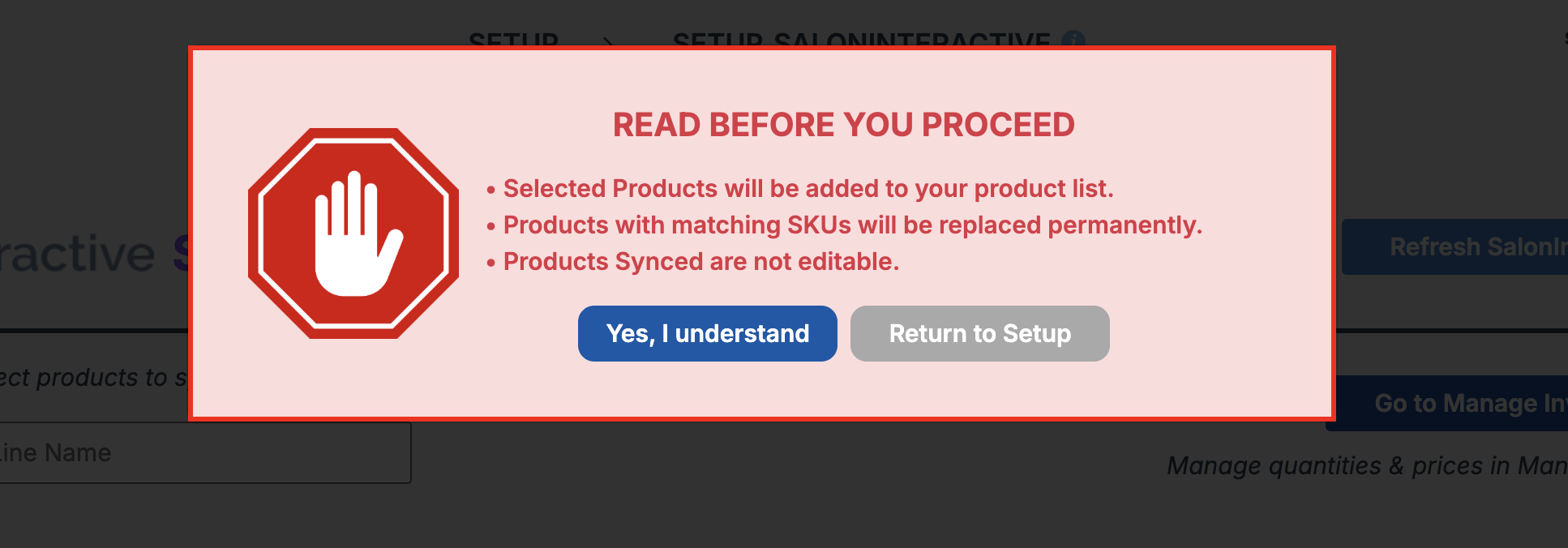 Replace Matching SKUs: If your current setup has a matching sku to a product selected, it will be permanently replaced with the SalonInteractive settings for that product.