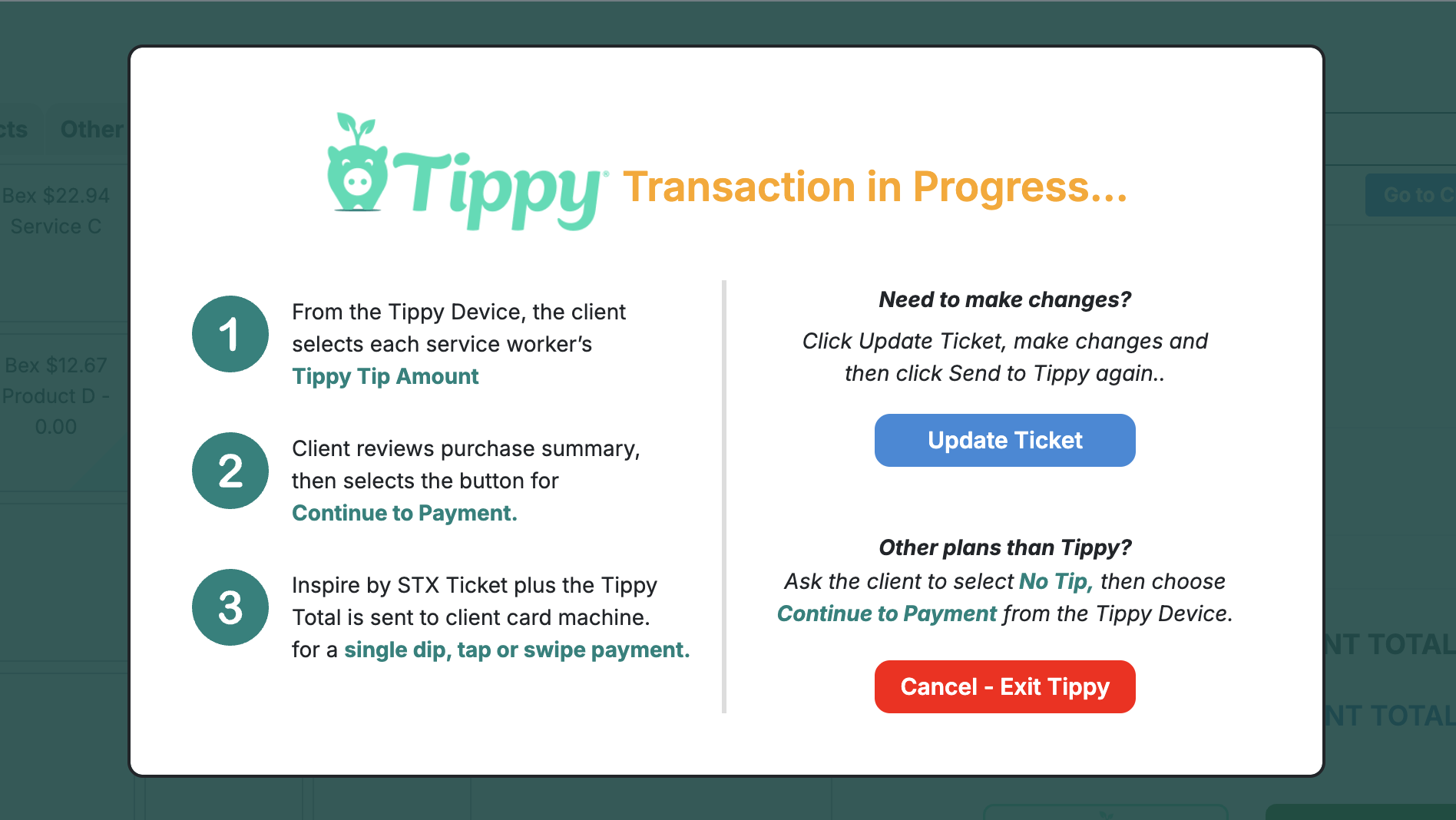 Update Ticket - Add, Remove or Update Line Items Once the Send to Tippy button has been clicked, a pop up will display. On the left, instructions will display on how to proceed with a Tippy and Credit Card transaction. If you need to make changes to ...